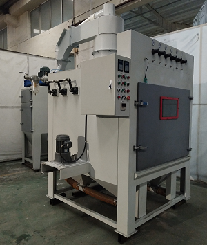 噴出后的磨料落回集砂斗內(nèi)循環(huán)使用。噴砂時產(chǎn)生的灰塵經(jīng)除塵箱吸塵風(fēng)機抽出,并經(jīng)分離器分離,好的磨料積至分離器底部,落回儲砂器循環(huán)使用,粉塵經(jīng)兩級分離,被吸至旋風(fēng)分離器集塵小車中。