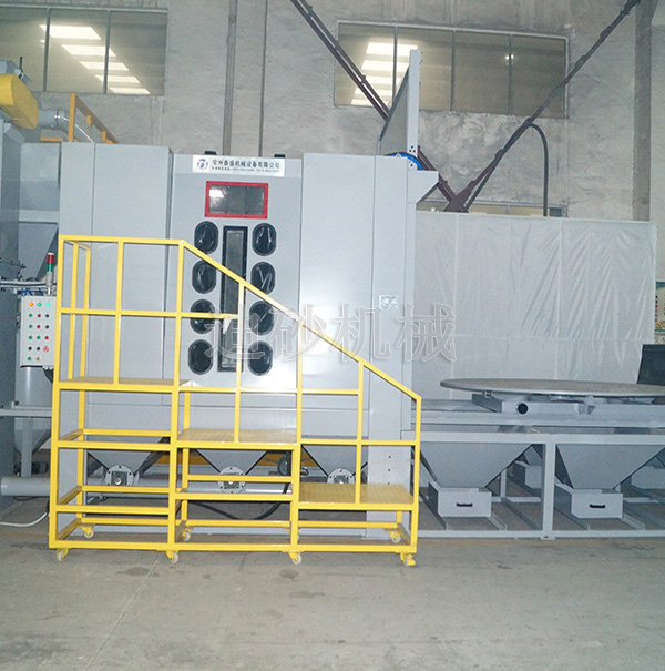 將工件裝夾在轉盤,由臺車帶動轉盤移動至噴砂加工位,移動到一定位置臺車被限位此時臺車停止移動動(手動),工件由轉盤帶動做緩慢旋轉(手動),手持噴砂槍對工件表面進行噴砂加工,加工完畢,臺車退出、裝卸工件。